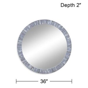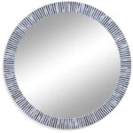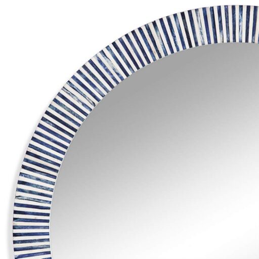 Delicate stripes of blue and white surround this contemporary bone round wall mirror.