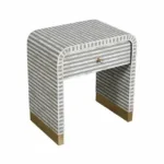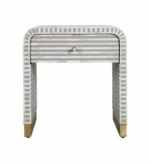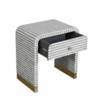 Each bedside table has been handcrafted from ethically sourced buffalo bone in India, ensuring every piece is unique in its disposition. The time-honored art of Bone Inlay was originally hand-crafted for the royal palaces of Uttar Pradesh, India. Handed down from generation to generation, intricate fragments of buffalo bones are hand-carved and then affixed to the base in a mosaic-like design. Resin is then used to fill the space around the bone.