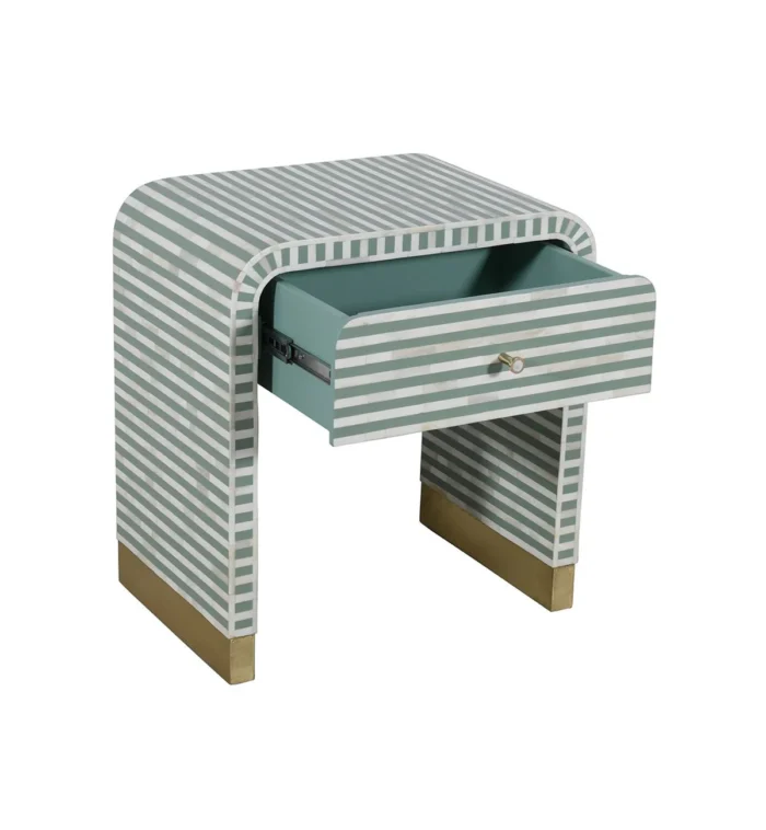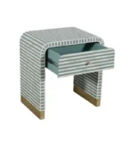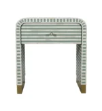 Each bedside table has been handcrafted from ethically sourced buffalo bone in India, ensuring every piece is unique in its disposition. The time-honored art of Bone Inlay was originally hand-crafted for the royal palaces of Uttar Pradesh, India. Handed down from generation to generation, intricate fragments of buffalo bones are hand-carved and then affixed to the base in a mosaic-like design. Resin is then used to fill the space around the bone.