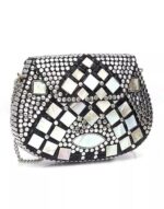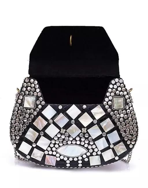 This Clutch Metal halfmoon clutch with stone work has one main compartment with flap closure and a detachable metal chain. Can also be used as a sling bag.