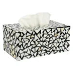 HIGH-QUALITY MOTHER OF PEARL INLAY TISSUE BOX HOLDERS is a lifestyle brand and a fair trade business for unique products handmade by artisans and craftsmen in different regions of India. We blend traditional handcrafting techniques with contemporary design in home decor & fashion to promote social uplift within artisan communities. All our products are crafted using traditional methods passed down through generations with ethically sourced, finest materials because we believe that the beautiful things you choose for your home today should bring you pleasure for many years to come. Shop our exclusively crafted and curated collection to decorate, accessorize and personalize your home or office today. THE TIMELESS ART OF SHELL INLAY No animal or living organism was harmed in the making of this beautiful tissue box holder. An inlay is a technique of inserting pieces of contrasting material into depressions made on a base object. The production of pearl inlay furniture and decorative items is a three-step process and requires up to a month to create each piece. First, the fragments of mother pearl shells are shaped delicately. Then these intricate shapes are affixed onto an MDF frame in a detailed & stylized pattern. After this, the colored resin is filled around the shaped pieces of MOP to craft the background. The mother of pearl shells is offset by the striking color of the resin to create an exotic-looking rustic piece of home decor.
